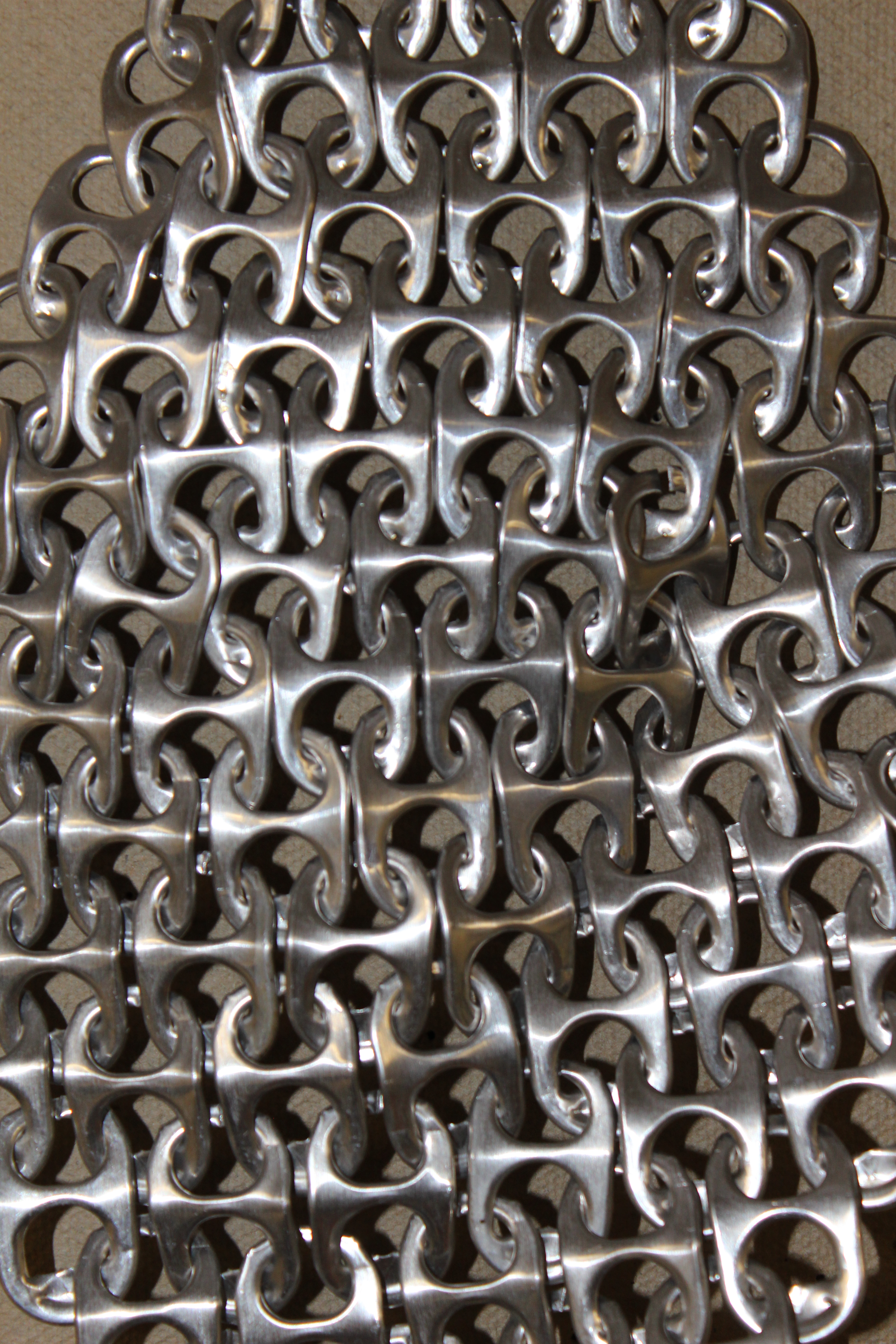 Soda tabs linked to form a sort of chain mail, candied corn,
