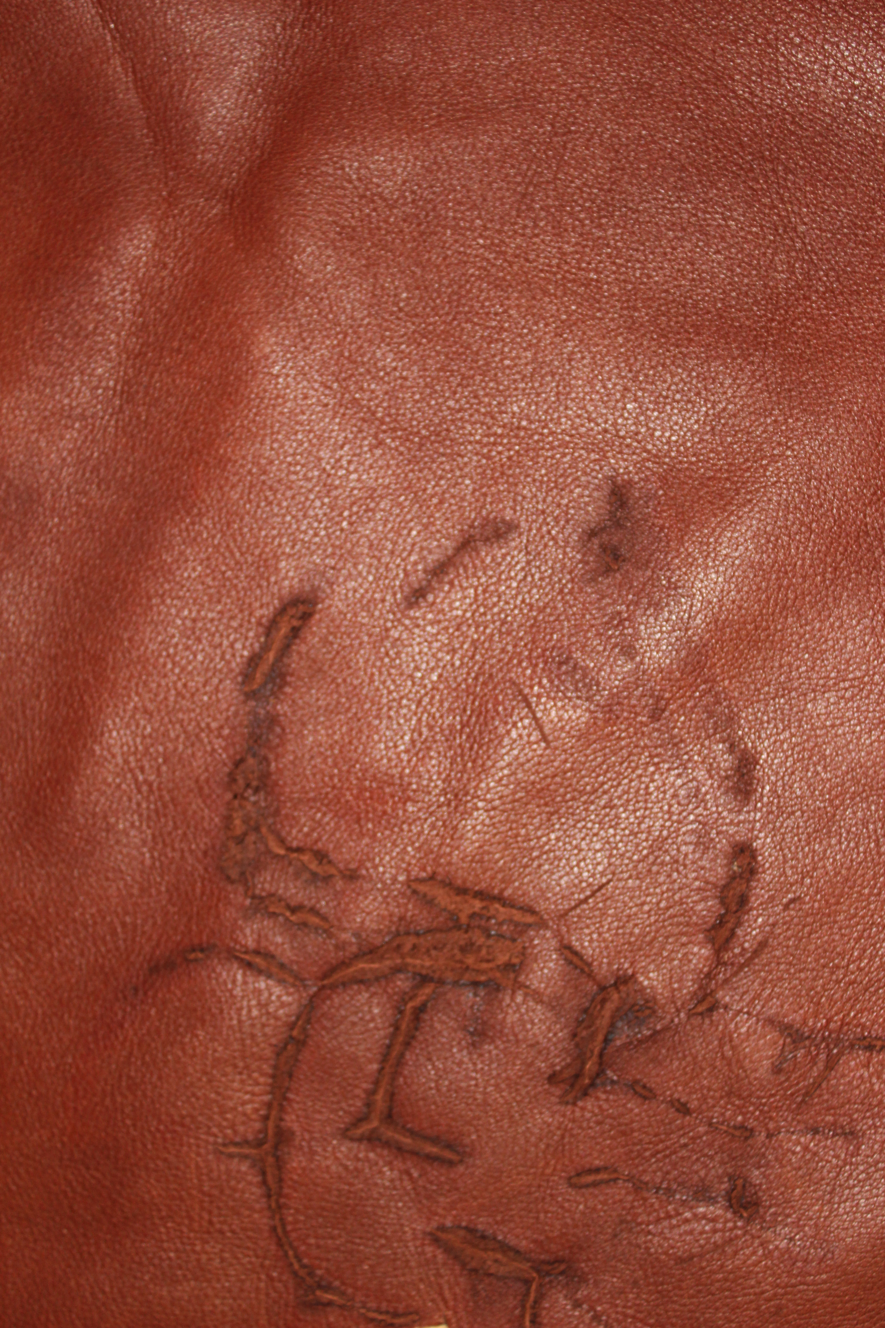 a scared scrap of leather, the back of a scared scrap of leather,