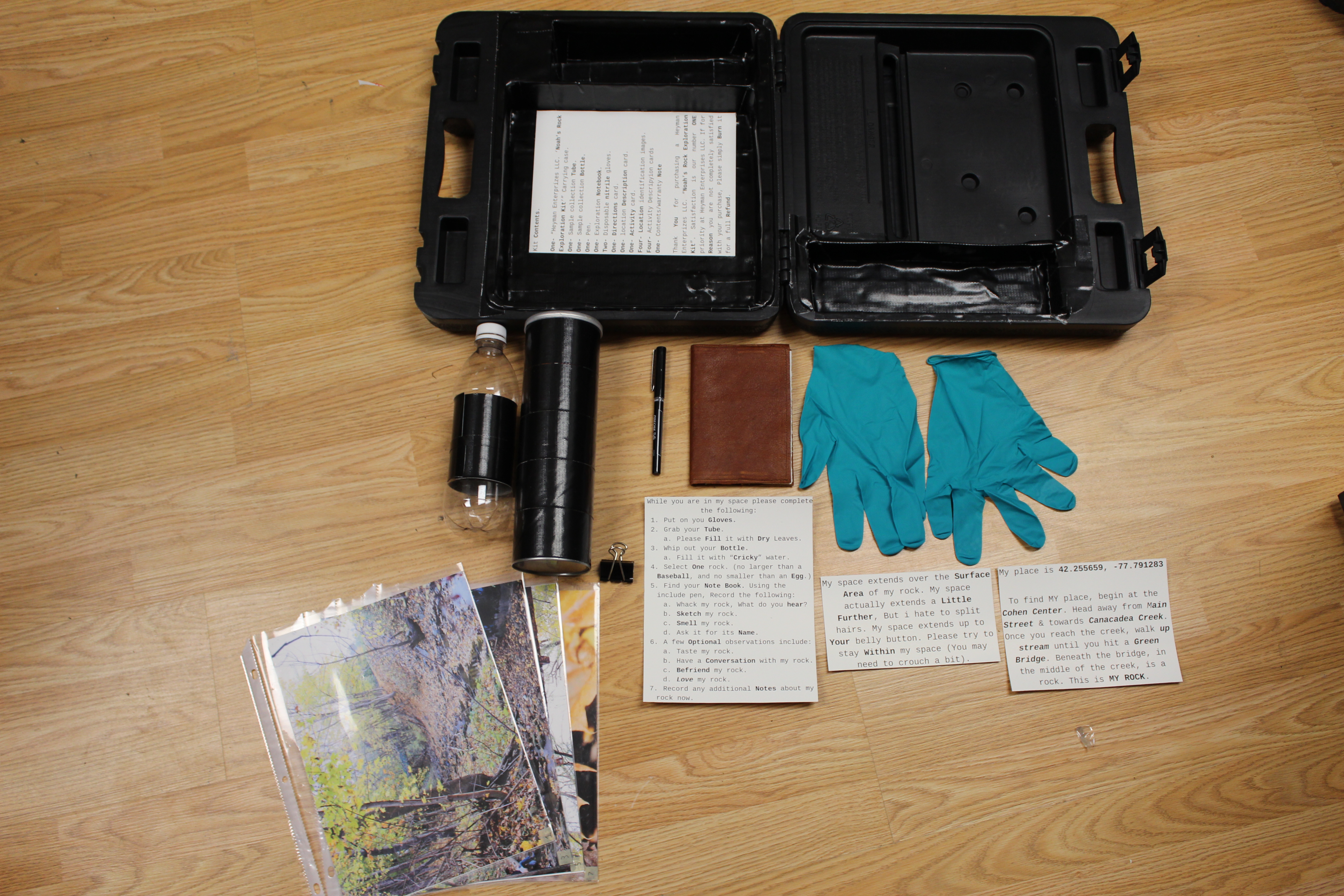 Included in my kit is a pair of gloves to keep your hands clean while you are working. There is also a “tube” and bottle for collecting samples as well as a note book to take notes in. There are also cards with information on locating my spot as well as the activities to be done while there. There are also a few images in order to assist in locating my space as well as offer a few suggestion for activities to do while there.