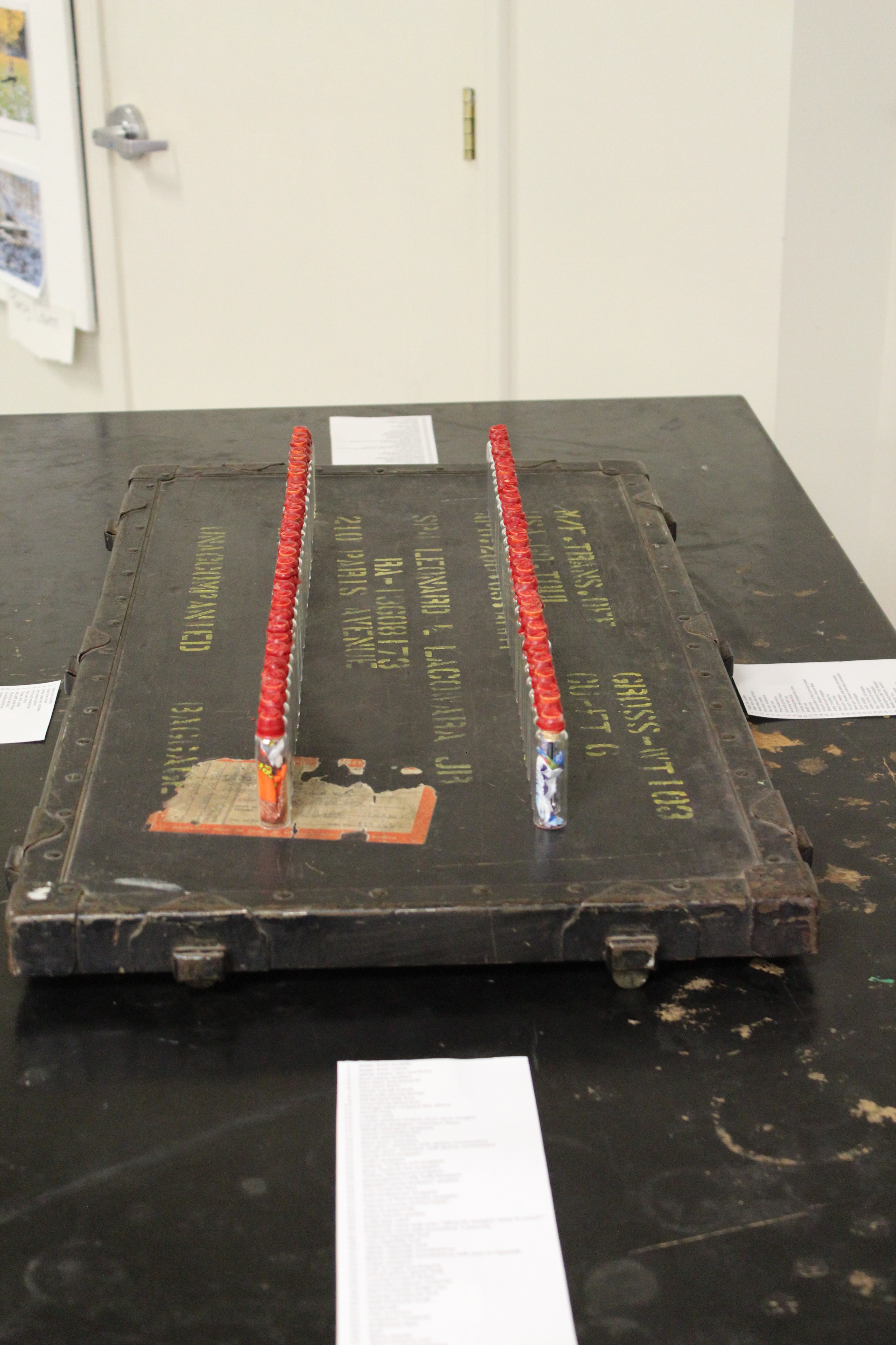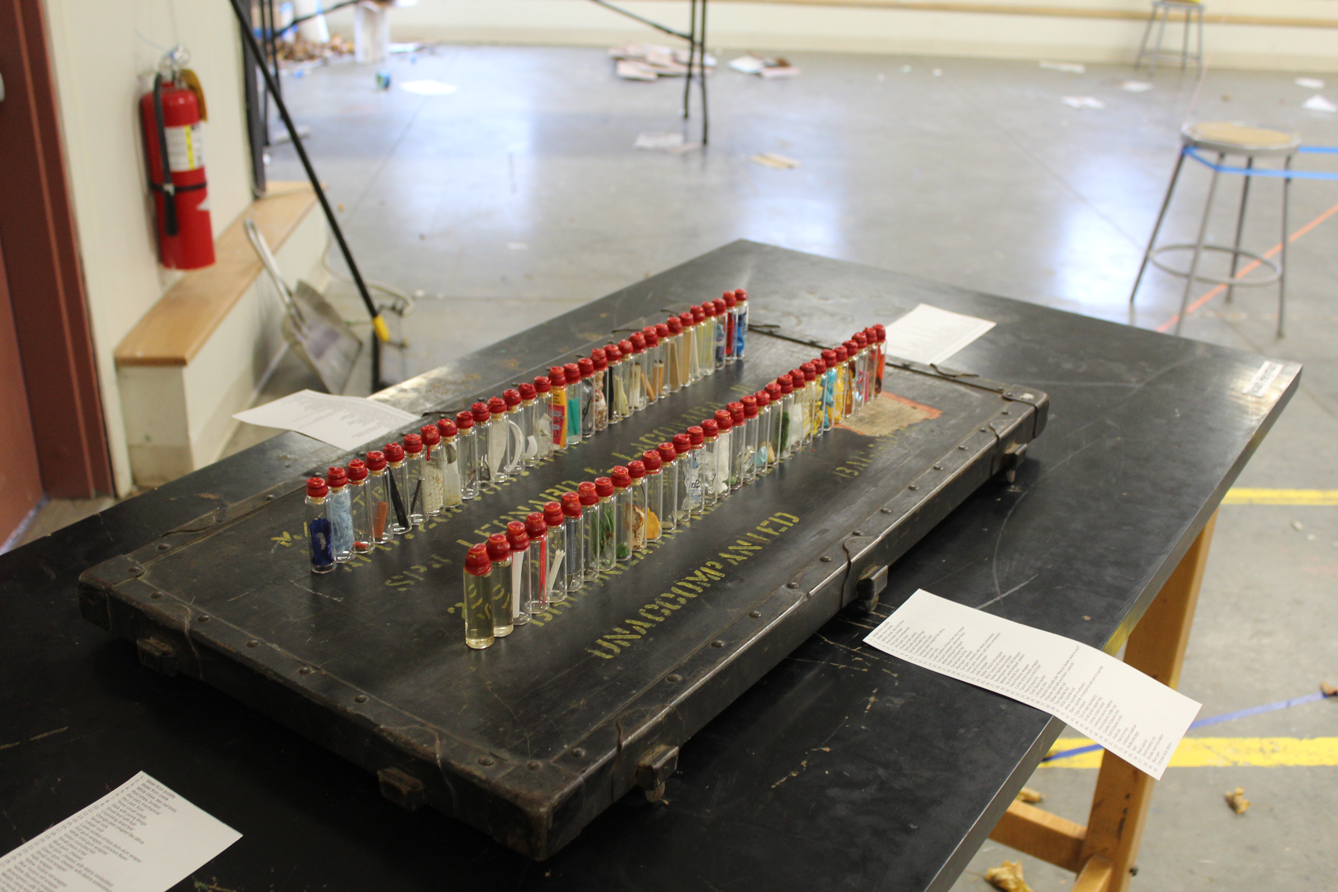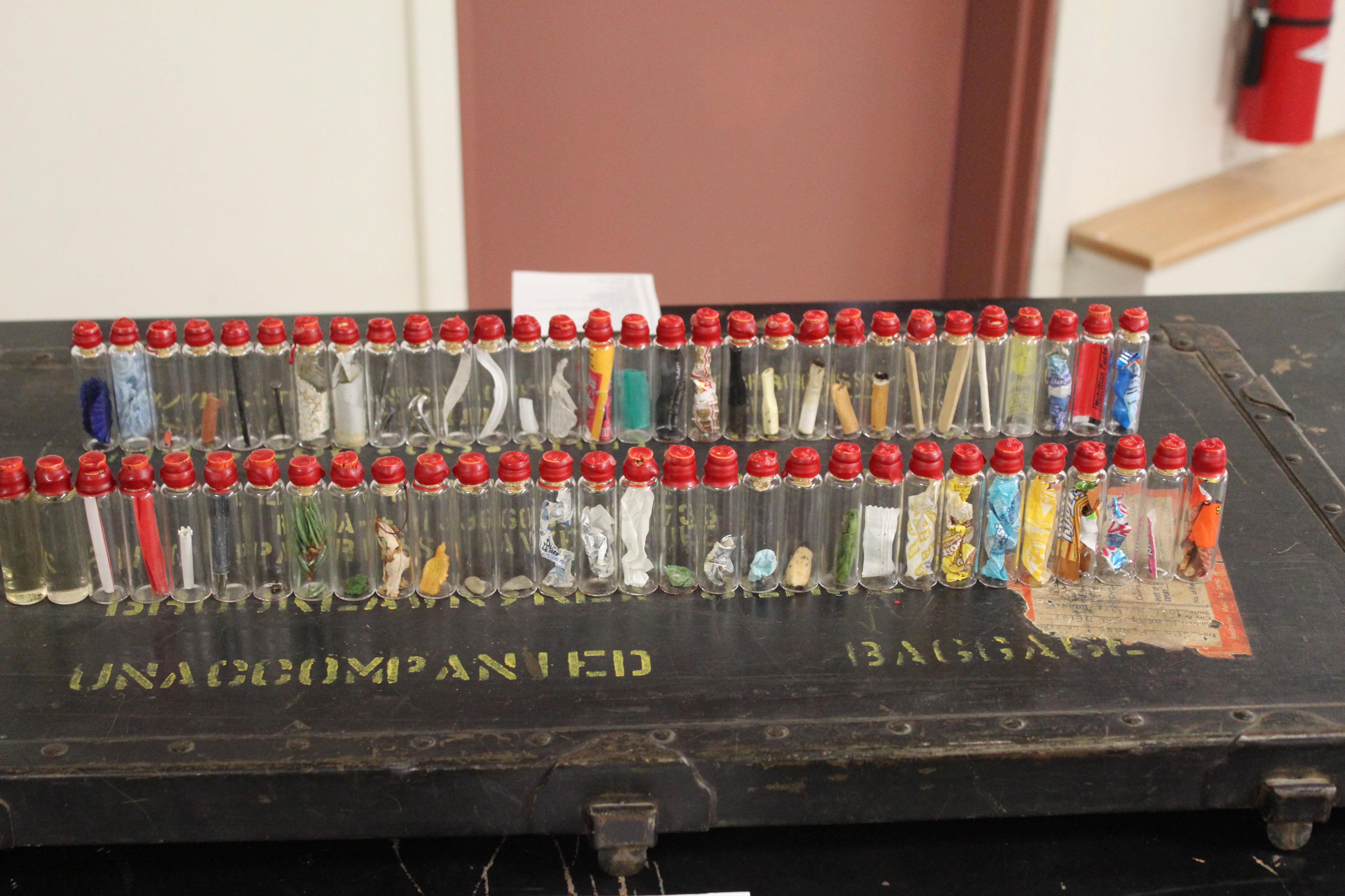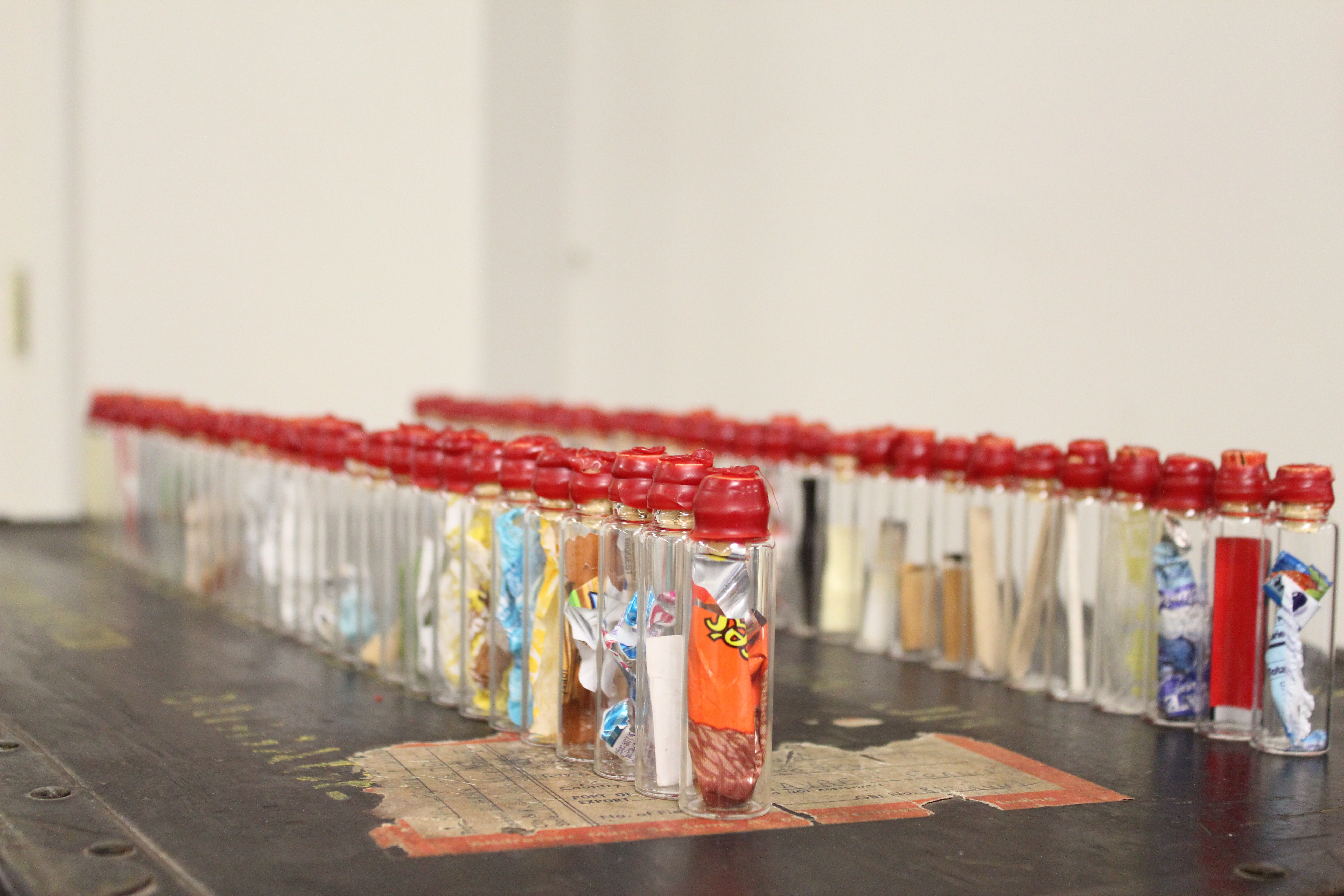 Lastly, for my installation, I decided to select a small glass vial, and collect anything that i could fit inside it. This turned into a slightly interesting task because it was teetering between pouring snowing and hailing while I was trying to collect my objects. I did manage, however, to collect a wide assortment of both natural and man made objects from the line. I had decided that i was going to limit myself to 60 vials (the number of corks I had). After bottling and corking each object, I sealed them with wax and stamped each seal with a number, one through sixty. I then created a list of the contents of each vial and set up my installation!
