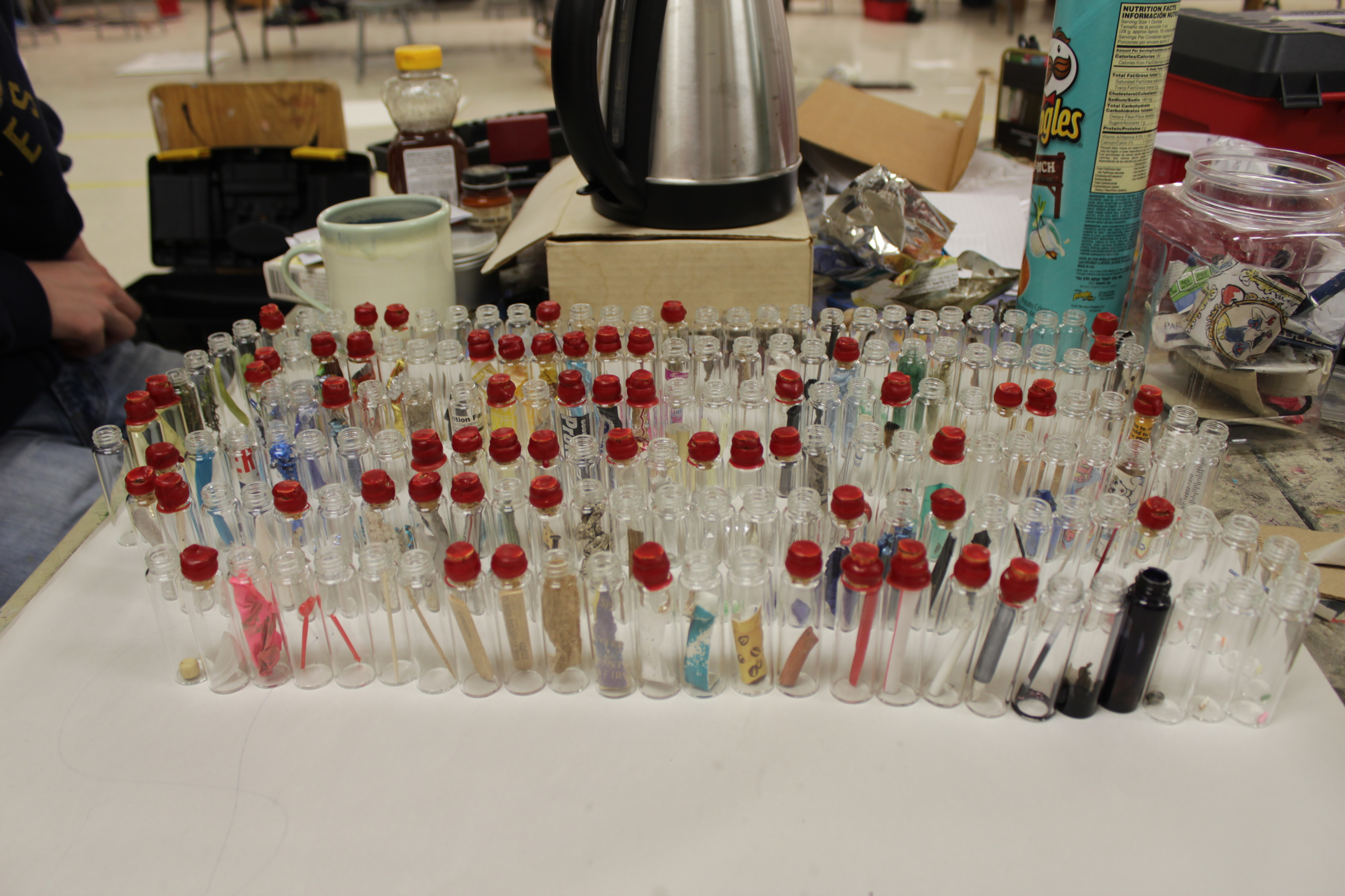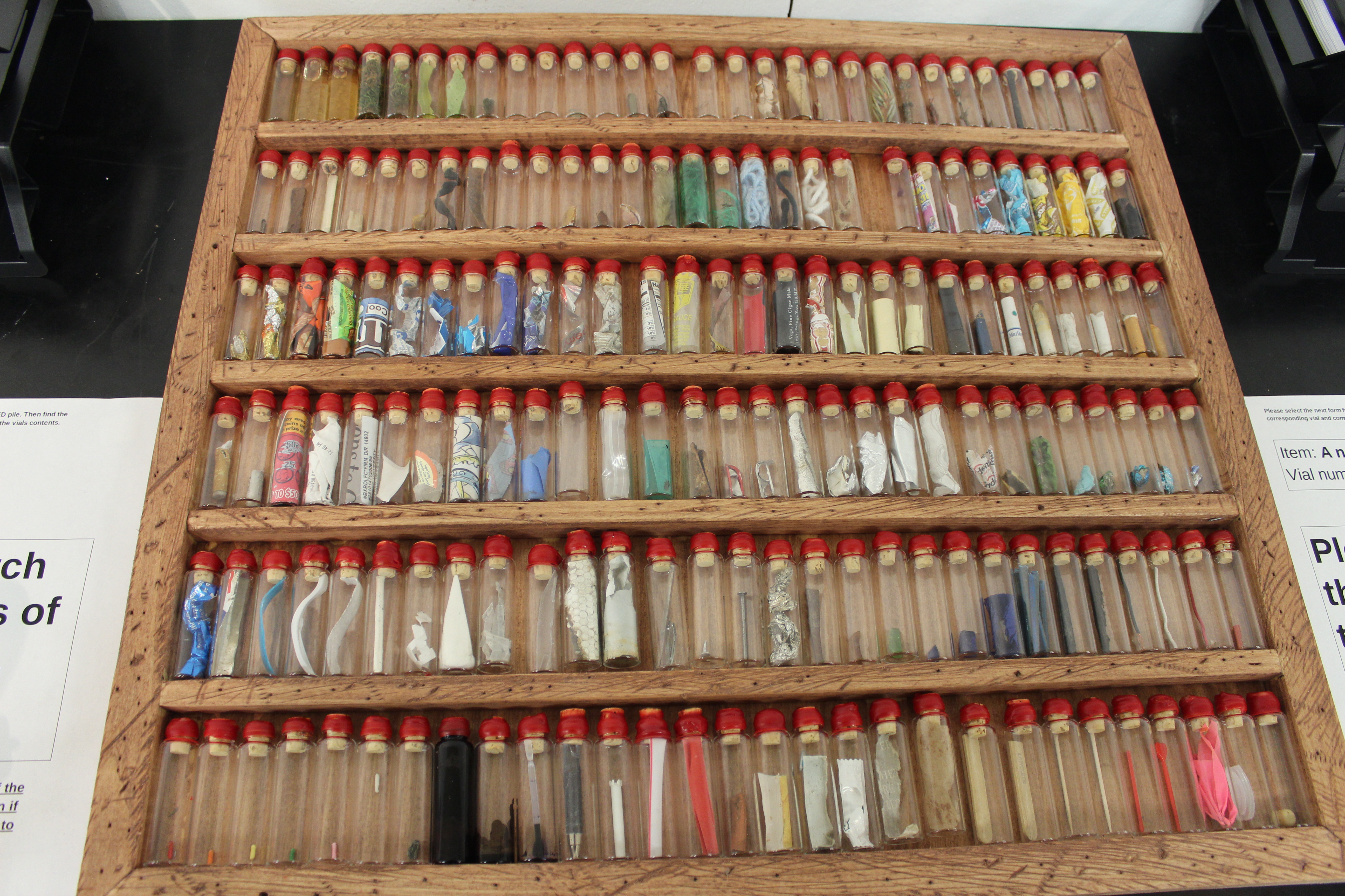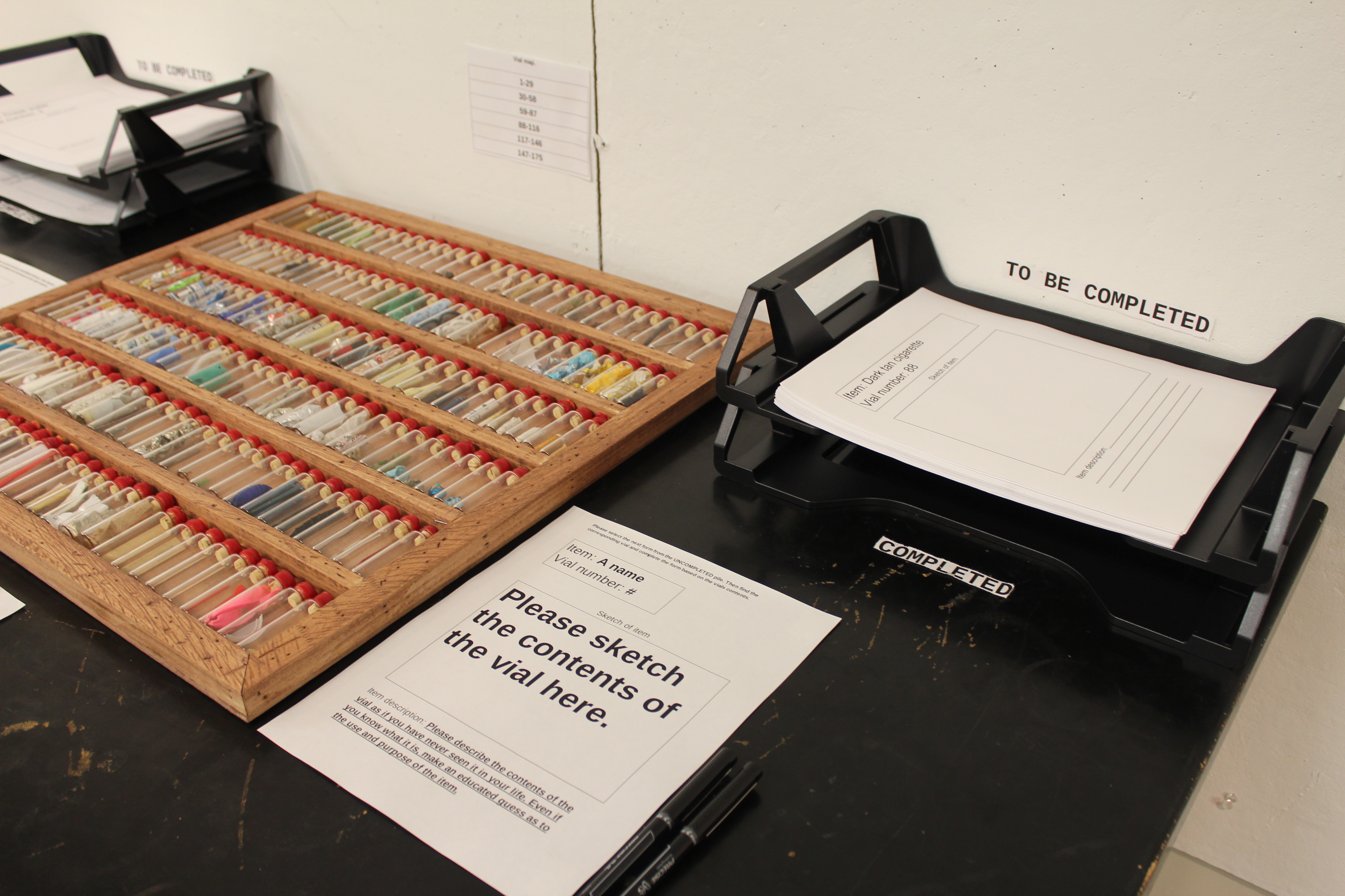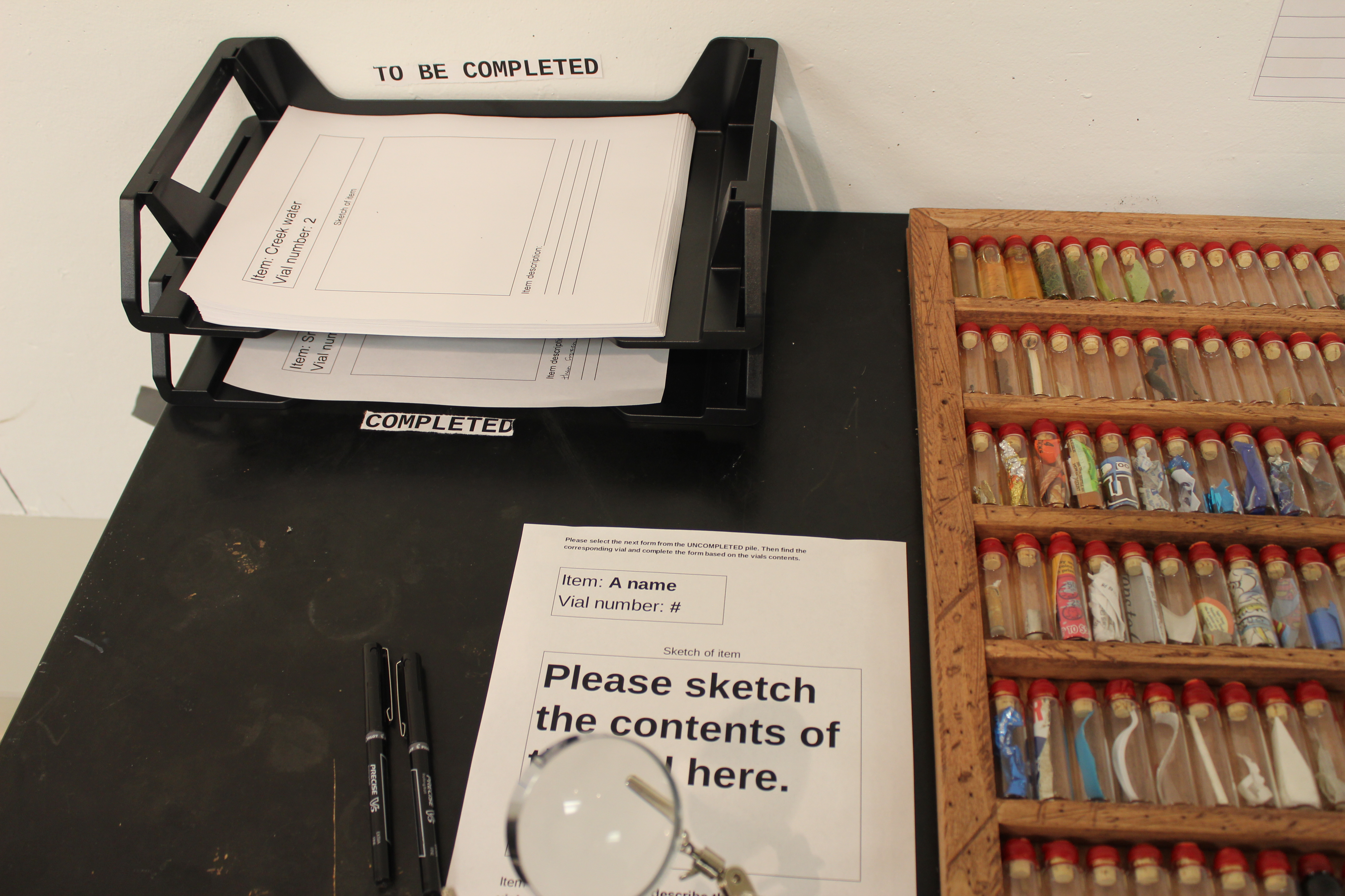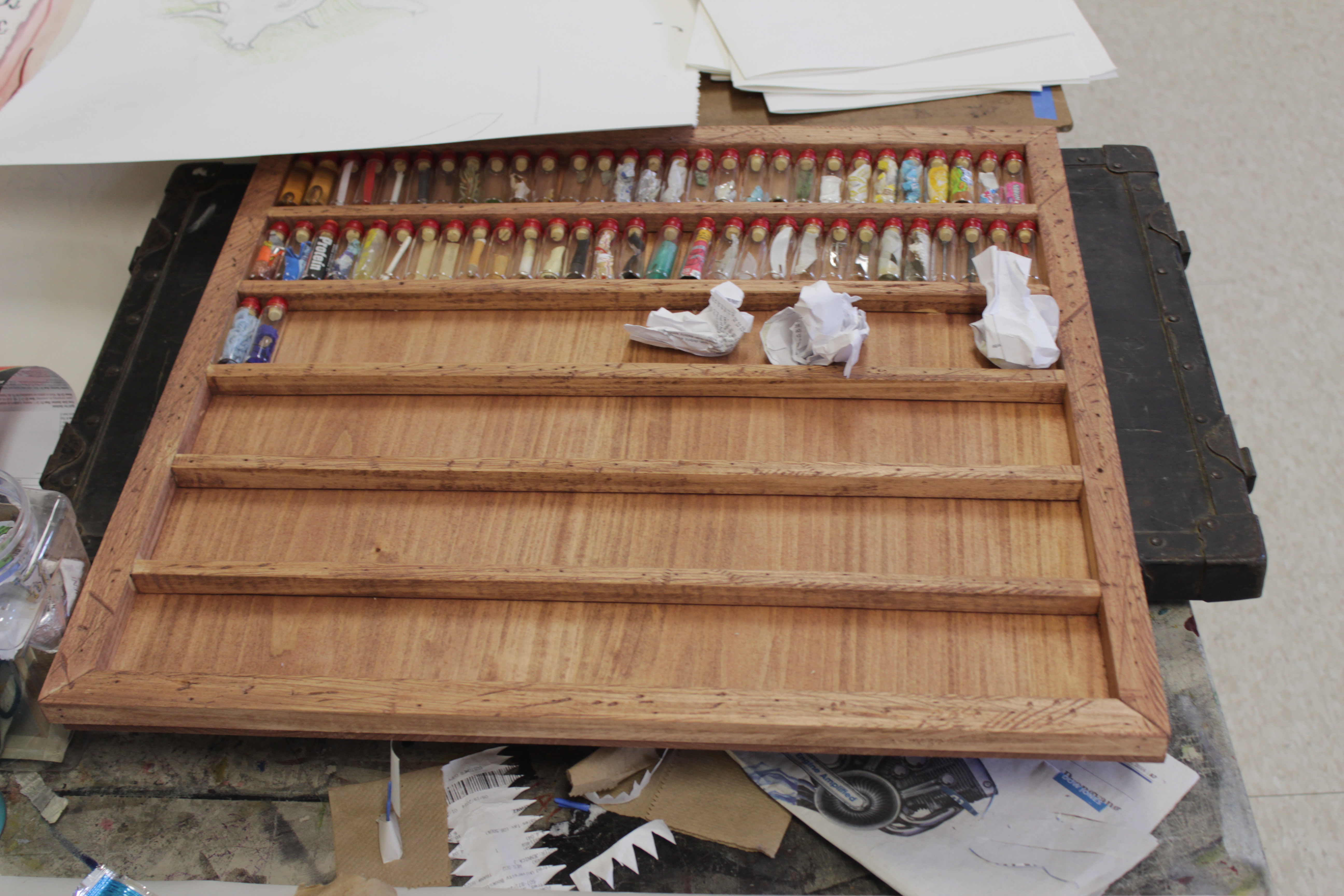 Lastly, for my installation, I decided to select a small glass vial, and collect anything that i could fit inside it. This turned into a slightly interesting task because it was teetering between pouring snowing and hailing while I was trying to collect my objects. I did manage, however, to collect a wide assortment of both natural and man made objects from the line. I had decided that i was going to limit myself to 60 vials (the number of corks I had). After bottling and corking each object, I sealed them with wax and stamped each seal with a number, one through sixty. I then created a list of the contents of each vial and set up my installation!